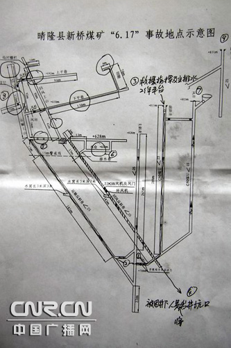 示意圖說(shuō)明:1為井下排水水倉(cāng);2為新儲(chǔ)備水倉(cāng);3為救援指揮部及主排水口平臺(tái);4為井下被困人員可能的出井通道;5為井下木料堆積巷道,估計(jì)有兩人,水位較低;6為煤礦排水倉(cāng),知情人介紹,有事故煤礦礦工固定在此位置排水。7為救援送風(fēng)口之一;8為人員可能的所在位置,其他畫(huà)圈地方為事故發(fā)生時(shí)井下被困人員可能存在的地方;9為另一送風(fēng)口。