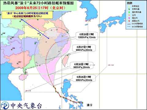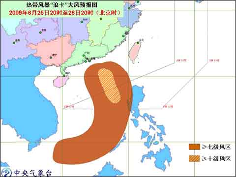 預(yù)計(jì),風(fēng)暴中心將以每小時(shí)15-20公里的速度向西北方向移動(dòng),以后將轉(zhuǎn)向偏北方向移動(dòng),逐漸向廣東中部到福建南部一帶沿海靠近,強(qiáng)度有所加強(qiáng),并有可能于明天夜間到后天白天在這一帶沿海登陸。受“浪卡”和西南季風(fēng)的共同影響,今天晚上到明天白天,南海東部和南部海面將有6-8級(jí)大風(fēng),“浪卡”中心經(jīng)過的附近海面的風(fēng)力可達(dá)9-10級(jí)。