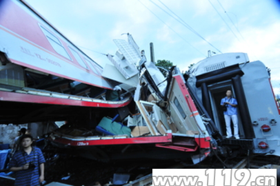 6月29日2時(shí)33分許,湖南公安消防總隊(duì)郴州市消防支隊(duì)指揮中心接到報(bào)警:飛虹橋道口兩列客運(yùn)火車相撞(K9017次列車撞上了稍前脫軌的K9063次列車),其中一列撞上附近一民房,請(qǐng)求救援。