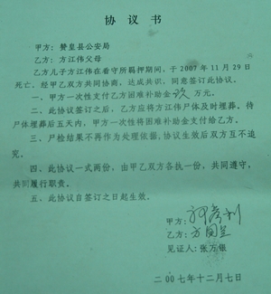 7月1日本報(燕趙都市報)刊發(fā)的《疑犯被逼喝涼水致終身殘疾》如一石擊水,讓"牢頭獄霸"、"躲貓貓"、"喝涼水"再次成為社會關(guān)注的焦點(diǎn)。而令人震驚的是,在調(diào)查秦英偉"喝涼水"致殘案過程中,本報記者又有驚人發(fā)現(xiàn):同是贊皇縣看守所,2007年4月至11月半年多時間內(nèi),兩個在押疑犯暴斃,最后都由當(dāng)?shù)毓膊块T出錢"協(xié)商解決",一位死者家屬給了"困難補(bǔ)助金"9萬元,另一位死者的家屬給了1.5萬元。