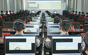 剛一進(jìn)門(mén),記者就聽(tīng)到槍炮聲、戰(zhàn)車(chē)轟鳴聲交織在一起。百余名官兵頭戴耳機(jī)端坐在電腦前緊張操控著鼠標(biāo)和鍵盤(pán),前方大屏幕上顯示“紅軍”裝甲戰(zhàn)車(chē)正快速通過(guò)“藍(lán)軍”炮火攔阻區(qū)。