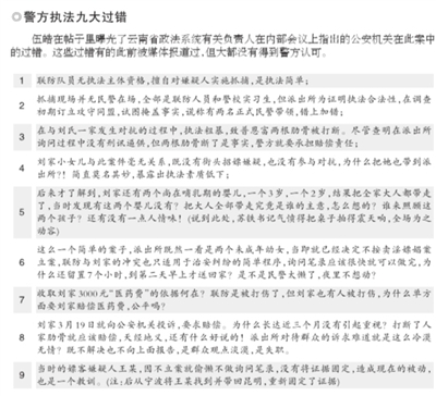帖子中,伍皓披露云南省政法系統(tǒng)有關(guān)負(fù)責(zé)人在聽取調(diào)查進(jìn)展報(bào)告過程中,“用了半個(gè)多小時(shí)詳細(xì)指出公安機(jī)關(guān)的過錯(cuò)”!爱(dāng)案情逐漸清晰,特別是查出劉家的兩個(gè)女兒互換衣服、故意誘導(dǎo)聯(lián)防抓錯(cuò)人以實(shí)施敲詐的情節(jié),基層公安機(jī)關(guān)都覺得松了一口氣,有人在匯報(bào)中說‘看來案子并沒有辦錯(cuò)’,有關(guān)負(fù)責(zé)人立即怒目圓瞪、厲聲喝斥,‘什么沒有辦錯(cuò)!這個(gè)案子,我們公安機(jī)關(guān)是有過錯(cuò)的’!”