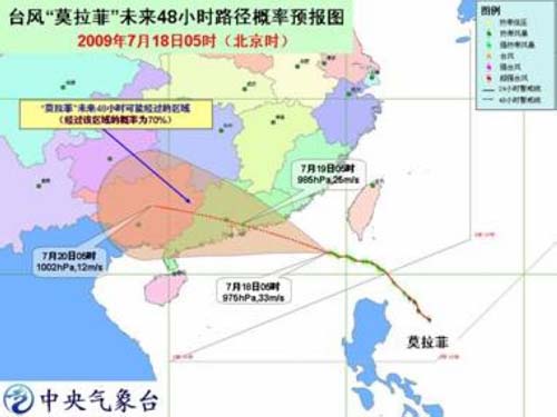 受“莫拉菲”及其外圍云系的影響,18日白天到夜間,東海南部海面、巴士海峽、巴林塘海峽、臺(tái)灣海峽、臺(tái)灣以東洋面、南海大部海面、臺(tái)灣省及其沿海、福建沿海、廣東沿海將有7-9級(jí)大風(fēng),“莫拉菲”中心經(jīng)過的附近海面或地區(qū)的風(fēng)力可達(dá)10-12級(jí),部分海域陣風(fēng)可達(dá)13-14級(jí);臺(tái)灣南部、福建南部 、廣東中東部、江西南部將有大到暴雨,其中臺(tái)灣西南部、福建東南部和廣東東南部等地有大暴雨,廣東東部沿海的部分地區(qū)有特大暴雨。