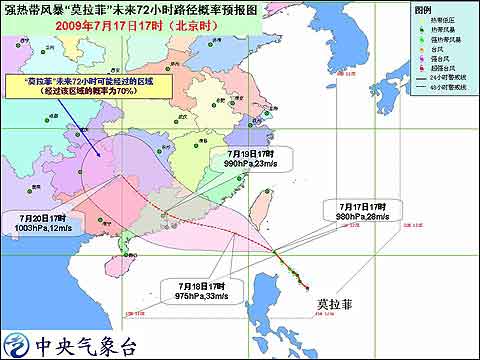 為應對臺風“莫拉菲”的兇猛襲擊,二十四小時內(nèi),中國氣象局兩次提高氣象災害應急響應命令級別。18日早中國氣象局局長鄭國光宣布將氣象災害應急響應級別提高至Ⅱ級。并立即派出工作組,赴現(xiàn)場指導氣象服務和災害防御工作。