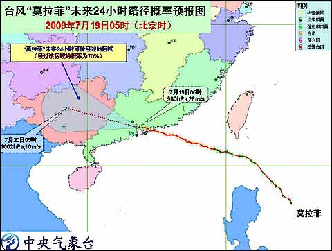 受“莫拉菲”及其外圍云系的影響,19日白天到夜間,南海北部海面、廣東西部沿海及珠江三角洲將有6-8級(jí)大風(fēng),部分海域或地區(qū)風(fēng)力有9-10級(jí);廣東西部、廣西中南部以及云南東南部等地有暴雨,其中,廣東西部和廣西中南部的部分地區(qū)有大暴雨。