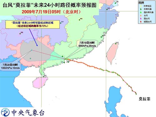 受“莫拉菲”及其外圍云系的影響,19日白天到夜間,南海北部海面、廣東西部沿海及珠江三角洲將有6-8級大風(fēng),部分海域或地區(qū)風(fēng)力有9-10級;廣東西部、廣西中南部以及云南東南部等地有暴雨,其中,廣東西部和廣西中南部的部分地區(qū)有大暴雨。