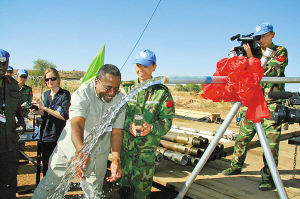 蘇丹是一個(gè)極度缺水的國家,常年動(dòng)亂的一個(gè)重要原因就是爭奪水源。西方地質(zhì)學(xué)家勘測后曾認(rèn)定北部達(dá)爾富爾地區(qū)無地下水。北京軍區(qū)給水團(tuán)維和官兵的主要任務(wù)是在這里進(jìn)行水源勘察并構(gòu)筑供水井,解決達(dá)爾富爾地區(qū)維和部隊(duì)及維和警察生活保障用水。去年10月16日上午,一股清泉從火成巖中噴涌而出,標(biāo)志著我給水團(tuán)官兵開創(chuàng)了聯(lián)合國維和部隊(duì)用水自給的先河,同時(shí)也書寫了我軍工兵首次在國外找水打井成功的歷史。