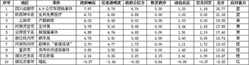 說明:本表數(shù)據(jù)為11位輿情分析師采用德爾菲法,對地方政府應對網(wǎng)絡輿情表現(xiàn)進行分項評估后得出。其中政府響應、信息透明度、政府公信力三項為常規(guī)指標,分值區(qū)域分別為-10~10分;恢復秩序、動態(tài)反應、官員問責三項為特殊指標,分值區(qū)域分別為-5~5分、-3~3分、-3~3分。輿情分析師依據(jù)以上各項指標對政府表現(xiàn)分別做出評價,政府表現(xiàn)越出色、應對越得體則得分越高,反之則得分越低。最終依據(jù)各項表現(xiàn)綜合所得總分,得出藍、黃、橙、紅四級警報級別,警報程度相應由低到高。其中總分20.00分以上為藍色警報,政府應對總體較為得體;總分15.00~19.99分為黃色警報,政府應對有待進一步加強;總分10.00~14.99為橙色警報,政府應對存在明顯問題;總分10.00分以下為紅色警報,政府應對嚴重失當,存在重大缺陷。