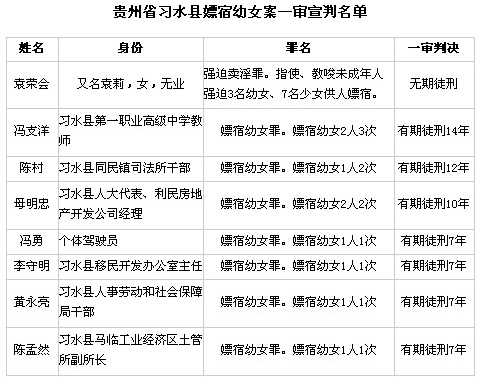 其中,被告人馮支洋(習(xí)水縣第一職業(yè)高級中學(xué)教師)嫖宿幼女2人3次;被告人陳村(習(xí)水縣同民鎮(zhèn)司法所干部)嫖宿幼女1人2次;被告人母明忠(習(xí)水縣人大代表、利民房地產(chǎn)開發(fā)公司經(jīng)理)嫖宿幼女2人2次;被告人馮勇(個(gè)體駕駛員)、李守明(習(xí)水縣移民開發(fā)辦公室主任)、黃永亮(習(xí)水縣人事勞動和社會保障局干部)、陳孟然(習(xí)水縣馬臨工業(yè)經(jīng)濟(jì)區(qū)土管所副所長)分別嫖宿幼女1人1次。