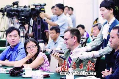 昨日下午3時,廣州珠島賓館紅棉廳,來自美、英、法、德、日、韓、新加坡、香港等8個國家和地區(qū)20家境外主流媒體41名記者把長槍短炮架了起來。他們此次到廣東采訪,有一個共同的“條件”:“要見廣東省委書記汪洋”。