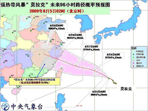預計,“莫拉克”將以每小時15-20公里的速度向西偏北方向移動,強度繼續(xù)加強,今天白天對中國近海無影響。