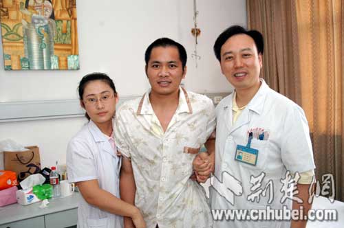 4日,在中南醫(yī)院綜合醫(yī)療科19樓病房,窗外是優(yōu)美的湖光山色,窗內(nèi)是譚紀(jì)雄燦爛的笑容。譚紀(jì)雄一邊接受按摩治療,一邊和醫(yī)生愉快交談,言語風(fēng)趣,表述順暢,和正常人幾乎沒有兩樣。