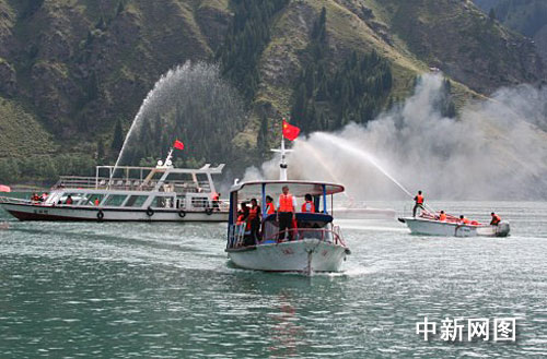 中新社烏魯木齊八月五日電 (記者 孫亭文)四日,新疆維吾爾自治區(qū)交通廳地方海事局在新疆著名旅游景點天山天池舉行水上安全應急演習。據(jù)介紹,是次演習出動各類船艇十余艘,參演人員近百名,是新疆水上舉辦的參演力量最強、參演科目最多、險情較為復雜的一次綜合性水上安全應急處置,是對水上安全突發(fā)事件發(fā)生時與地方各相關部門、單位密切協(xié)作配合的一次“實戰(zhàn)練兵”。