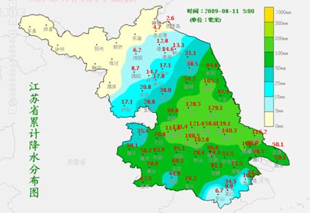 受“莫拉克”影響,10日江蘇淮河以南地區(qū)出現(xiàn)大范圍暴雨到大暴雨。據(jù)統(tǒng)計(jì),截至11日05時(shí), 江蘇38個(gè)臺(tái)站24小時(shí)雨量在50毫米以上,其中南通、泰州、鹽城、鎮(zhèn)江、揚(yáng)州共14個(gè)臺(tái)站在100毫米以上,最大雨量出現(xiàn)在姜堰(150.6毫米)。另?yè)?jù)加密自動(dòng)站觀測(cè),有118個(gè)站雨量在100毫米以上,最大雨量姜堰蔣垛(179.3毫米)!澳恕边使淮河以南地區(qū)普遍出現(xiàn)7-8級(jí)大風(fēng),沿海9-10級(jí),最大風(fēng)速達(dá)11級(jí) (28.6m/s,射陽(yáng)丹頂鶴保護(hù)區(qū))。