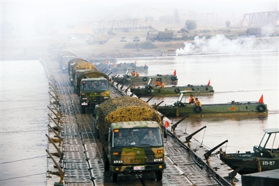 今天(11日)凌晨5時(shí),蘭州軍區(qū)某舟橋團(tuán)在黃河某渡口架設(shè)一座250多米長的浮橋。6時(shí)整,由700多輛輪式車輛組成的摩托化部隊(duì)隆隆駛過。11時(shí),兩架搭載蘭州軍區(qū)某師前指和特戰(zhàn)分隊(duì)人員的民航客機(jī),從西北某機(jī)場升空向東北某機(jī)場飛去。與此同時(shí),兩列運(yùn)載裝甲裝備、特種裝備和工程機(jī)械的專列分別在銀川、青銅峽火車站整裝待發(fā),準(zhǔn)備奔向東北大地。至此,“跨越—2009”系列實(shí)兵檢驗(yàn)性演習(xí)拉開序幕。