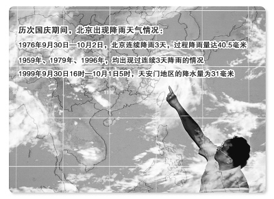 歷次國(guó)慶期間,北京曾經(jīng)出現(xiàn)過幾次大雨和連續(xù)性降雨:1976年9月30日—10月2日,北京連續(xù)降雨3天,過程降雨量達(dá)40.5毫米;1959年、1979年和1996年也出現(xiàn)過連續(xù)3天降雨的情況;1999年國(guó)慶50周年前夜,北京出現(xiàn)降雨,一直持續(xù)到10月1日早晨。9月30日16時(shí)到10月1日5時(shí),天安門地區(qū)的降水量為31毫米,給國(guó)慶活動(dòng)的前期準(zhǔn)備工作造成了影響。
