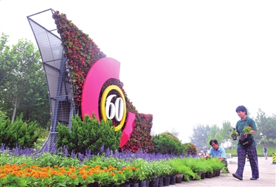 昨天,國慶60周年大型花壇“普天同慶”基本完工,用鮮花等材料構建的“60”及“紅旗”亮相朝陽公園東門。這是今年國慶第一個完工的大型花壇,也是城區(qū)公園和環(huán)線要道最具國慶色彩的花壇。