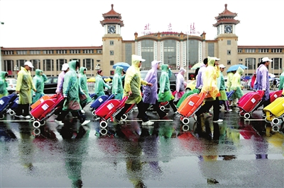 在天安門前,每隔8米一個(gè)崗哨,每個(gè)武警的腳下,都放著一個(gè)裝著雨衣的布包。下午4點(diǎn)半,因降雨變大,不但武警穿上了深綠色雨衣,長安街沿街的所有音響也都套上了“雨衣”。