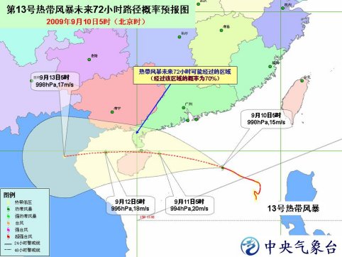 中新網(wǎng)9月10日電 中央氣象臺(tái)10日6時(shí)發(fā)布臺(tái)風(fēng)橙色警報(bào):南海熱帶低壓于今天早晨加強(qiáng)為今年第13號(hào)熱帶風(fēng)暴,今天早晨5時(shí)風(fēng)暴中心位于海南省文昌市東偏南方向大約550公里的海面上,就是北緯18.8度、東經(jīng)116.0 度,中心附近最大風(fēng)力有8級(jí)( 18 米 / 秒)。