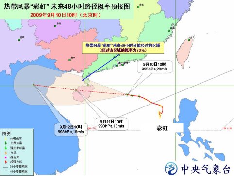 中新網9月10日電 中央氣象臺今日發(fā)布臺風橙色警報:今年第13號熱帶風暴“彩虹”的中心今天上午10時位于海南省文昌市東偏南方向大約400公里的南海北部海面上,就是北緯19.0度、東經114.7度,中心附近最大風力有8級(20米/秒)。