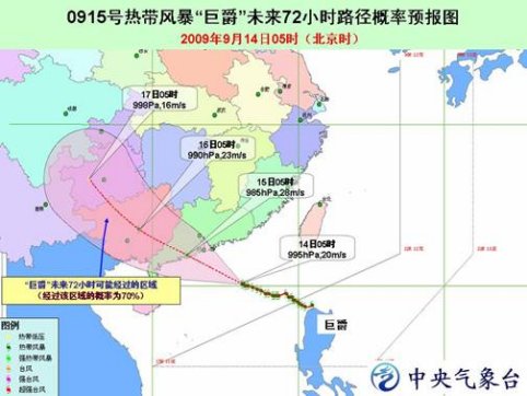 中新網(wǎng)9月14日電 中央氣象臺今日06時發(fā)布臺風(fēng)橙色警報(bào):今年第15號熱帶風(fēng)暴“巨爵”(Koppu ,名字來源于日本,指巨爵星座)的中心今天早晨 5 時位于廣東陽江東南方大約 480 公里的南海北部海面上,就是北緯20.1度、東經(jīng)116.2度,中心附近最大風(fēng)力有9級(23 米/秒)。