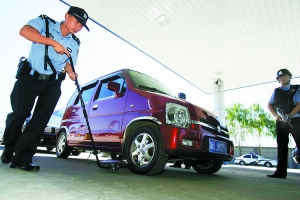 車子駛?cè)霗z查站后,絕大多數(shù)司機會立即遞出駕照、行駛本和身份證。如果車輛和人員沒有任何可疑之處,檢查時間極為短暫。如民警認為必要,會要求司機下車,打開后備箱,或者使用手持安檢儀、身份證識別儀、車底檢查鏡,對車輛和人員進行較細致的檢查!鞍讖R檢查站每天可檢查17000輛車,6萬多人。”檢查站站長齊躍警官告訴記者,當(dāng)發(fā)現(xiàn)有可疑車輛,民警會要求該車駛出車道,在旁邊空場上檢查。發(fā)現(xiàn)可疑人員或需要重點檢查的人員之后,會將他們帶入候檢大廳,使用大廳里的安檢門、X光機等設(shè)備進行檢查。