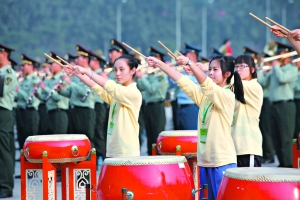 昨日下午3點(diǎn)開(kāi)始,聯(lián)合軍樂(lè)團(tuán)和合唱團(tuán)、民族打擊樂(lè)團(tuán)共4000余人在聯(lián)合軍樂(lè)團(tuán)駐地進(jìn)行了合練。記者在現(xiàn)場(chǎng)看到,廣場(chǎng)樂(lè)聲悠揚(yáng),氣氛熱烈。一些大學(xué)生合唱團(tuán)成員從各自高校乘大巴趕至郊外,有些學(xué)生暈車(chē)剛吐完就上場(chǎng)加入合練。