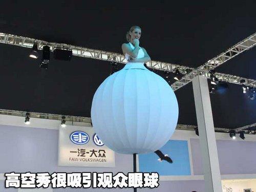 一個高高的桿子上面裝了一個雪白的球,球里面竟然冒出一個金發(fā)碧眼的美女!在大眾的展臺前,三位外國模特吸引了無數(shù)觀眾圍觀。 只見洋美女穿著雪白的裙子,爬上了一根高達(dá)3米的桿子,然后從腳下生出一個“雪球”,“雪球”把人的下半身都包裹在內(nèi),只露出上半身。三個高桿,三位美女,在空中擺出各種舞蹈姿勢,瞬間秒殺了無數(shù)相機(jī)。