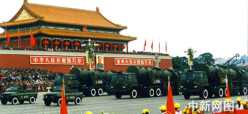 新中國五十周年國慶閱兵二十五個戰(zhàn)車方隊中最后四個方隊展示的是中國自力更生研制的戰(zhàn)略、戰(zhàn)術(shù)地地導(dǎo)彈系列,顯示中國常規(guī)與核戰(zhàn)略導(dǎo)彈反擊力量的整體作戰(zhàn)能力,受閱戰(zhàn)略導(dǎo)彈體積小了、威力更大了、機動性更強了,已從過去的固定發(fā)射形式發(fā)展到野外機動發(fā)射,具有全方位、全天候作戰(zhàn)能力和較強的防偵察、抗干擾能力。