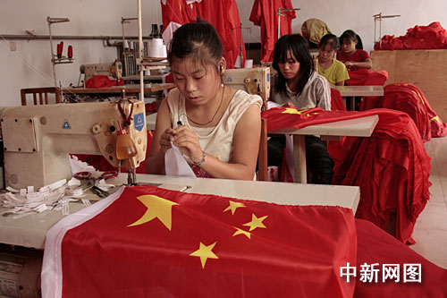 中新網(wǎng)石家莊9月26日電 (記者 徐艷輝 王穗)隨著國(guó)慶60周年日益臨近,全國(guó)各地的“紅妝”越來越濃,國(guó)旗也變得越來越搶手。25日,記者在河北省有名的“紅旗村”——藁城市梅花鎮(zhèn)屯頭村了解到,廠家不僅開足馬力生產(chǎn),而且有的廠家通過空運(yùn),盡快將國(guó)旗發(fā)往全國(guó)各地。