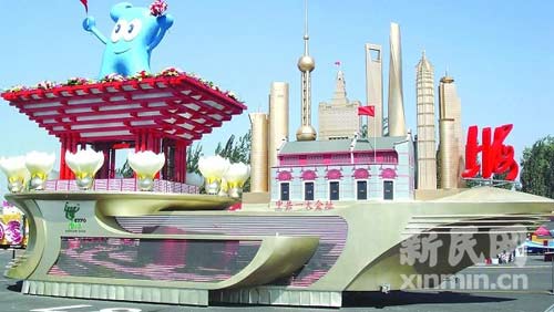 這輛名為“騰飛上!钡牟受囬L15米、寬6米,猶如一艘破浪前行的金色航船,船首是中共一大會址的建筑造型,背后是浦江兩岸的高樓大廈,后方為上海世博會中國館,上面有海寶揮舞國旗和鮮花,整個造型突出“上海背景,世博主題”,象征著上海乘風破浪,朝著建設國際金融中心和國際航運中心的目標快速前進。