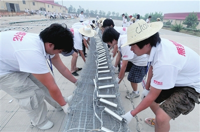 網(wǎng)幕焰火的“網(wǎng)幕”全部由長(zhǎng)僅2厘米的鋼絲網(wǎng)格組成,為了確保不出錯(cuò)誤,工人們將這張2250平方米的網(wǎng)幕平均切分成9塊,每塊分別標(biāo)示坐標(biāo)。之后,工人再將每個(gè)大塊的坐標(biāo)細(xì)化到每個(gè)網(wǎng)格,確定每個(gè)網(wǎng)格的“經(jīng)緯度”。同時(shí),根據(jù)畫面的要求,8萬(wàn)余發(fā)煙花的位置固定后,每發(fā)煙花對(duì)應(yīng)一個(gè)網(wǎng)格,將網(wǎng)格的“經(jīng)緯度”做成標(biāo)簽,粘貼在煙花上,數(shù)據(jù)差精確到毫米。