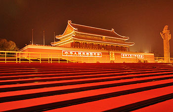 城樓下紅色觀禮臺同樣是外賓的一個重要集中場所。能登上這里的外賓主要分為幾個方面:一個是常駐北京的外國使節(jié)及夫人;一個是各國使館的武官及夫人;第三個就是各國家代表團(tuán)的隨團(tuán)人員。他們一般被安排在緊挨著天安門城樓東側(cè)最近的那個觀禮臺,憑請?zhí)M(jìn)入,觀禮證佩戴左胸前,一般在開會前一個小時入席,而且不能帶小孩。