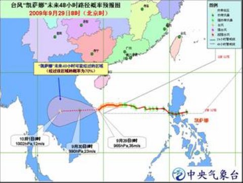 “凱薩娜”的中心29日10時(shí)位于越南廣義省以東大約40公里的南海西部海面上,就是北緯15.4度、東經(jīng)109.2度,中心附近最大風(fēng)力有12級(35米/秒),中心最低氣壓為965百帕。