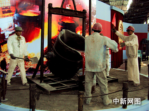 記者9月30日前往沈陽(yáng)市鐵西區(qū)鑄造博物館采訪,那里不僅有第一枚國(guó)徽的模型,還有一組蠟像,形象生動(dòng)地再現(xiàn)了當(dāng)年鑄造工人制作第一枚國(guó)徽時(shí)的情景。