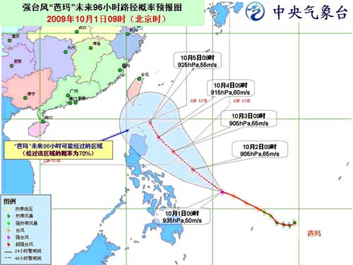 中新網(wǎng)10月1日電 據(jù)中國氣象局網(wǎng)站消息,今年第17號臺風(fēng)“芭瑪”于10月1日上午在菲律賓以東洋面加強為強臺風(fēng),1日9時其中心位于菲律賓馬尼拉東偏南方大約1110公里的洋面上,就是北緯12.0度、東經(jīng)130.9度,中心附近最大風(fēng)力有15級(50米/秒),中心最低氣壓為935百帕。