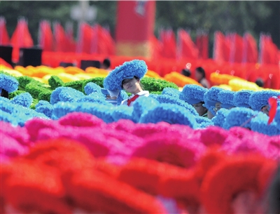 路建康說,他要感謝組成七色光方隊的1500名四、五年級的小學(xué)生們。這些孩子站在背景最前沿,離閱兵隊伍最近,他們組成了七彩花環(huán),寓意團(tuán)圓。游行結(jié)束,七色光方隊要涌向金水橋。