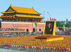 六十年前的“十一”,毛澤東在開(kāi)國(guó)大典上向世界莊嚴(yán)宣告:“中華人民共和國(guó),中央人民政府,今天成立了!”在新中國(guó)成立六十周年的慶典上,這聲音再次響徹天安門(mén)廣場(chǎng)。毛澤東巨幅畫(huà)像及“毛澤東思想萬(wàn)歲”、“中國(guó)人民從此站起來(lái)了”兩句標(biāo)語(yǔ),出現(xiàn)在游行方陣中,似乎將人們帶回到六十年前新中國(guó)開(kāi)國(guó)大典的振奮時(shí)刻。
