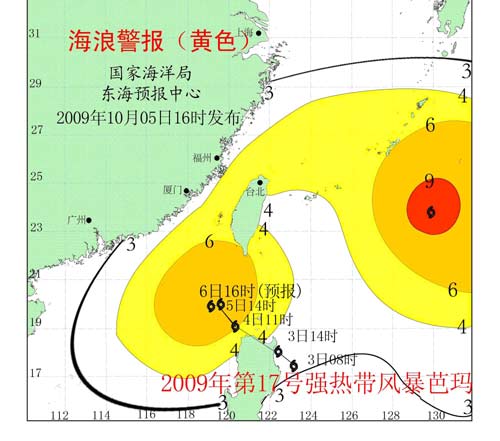 中新網(wǎng)10月5日電 國(guó)家海洋局東海預(yù)報(bào)中心根據(jù)《風(fēng)暴潮、海浪、海冰和海嘯災(zāi)害應(yīng)急預(yù)案》發(fā)布海浪Ⅲ級(jí)警報(bào)(黃色)。