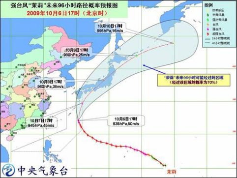 預(yù)計(jì),“茉莉”將以每小時(shí)25公里左右的速度向偏北方向移動(dòng),7日將轉(zhuǎn)向東北方向移動(dòng),強(qiáng)度趨于減弱,并逐漸向日本中部沿?拷。