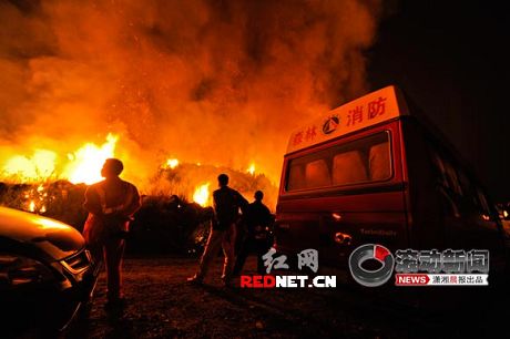 8日晚9點左右,記者趕到現(xiàn)場。在永和鎮(zhèn)內(nèi)即可看到遠遠一山頭火光沖天,循著火光記者找到了事發(fā)點。此時爆炸點附近已被封閉,現(xiàn)場救援人員正在點燃路邊的雜草,火勢越燒越旺,瞬間整個山頭都被大火覆蓋,半邊天空都被燒紅了。