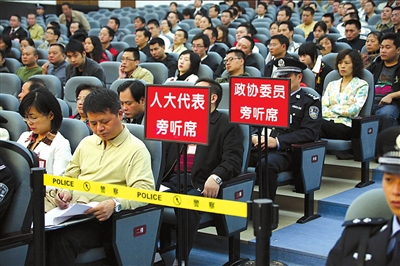在一中院庭審現(xiàn)場(chǎng),有20余名市人大代表和政協(xié)委員坐在旁聽(tīng)席上,他們是專(zhuān)門(mén)受邀進(jìn)行現(xiàn)場(chǎng)監(jiān)督。據(jù)悉,起訴到各中院或上訴至市高院的重點(diǎn)“涉黑涉惡”案件的庭審均將邀請(qǐng)人大代表、政協(xié)委員現(xiàn)場(chǎng)監(jiān)督。