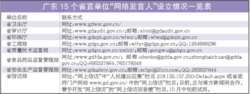 記者從省委辦公廳網(wǎng)絡(luò)信息資源處了解到,目前設(shè)立“網(wǎng)絡(luò)發(fā)言人”的15個(gè)省直部門是:省教育廳、省公安廳、省監(jiān)察廳、省勞動(dòng)和社會(huì)保障廳、省國(guó)土資源廳、省建設(shè)廳、省交通廳、省衛(wèi)生廳、省審計(jì)廳、省環(huán)保廳、省工商局、省質(zhì)量技術(shù)監(jiān)督局、省食品藥品監(jiān)督管理局、省安全生產(chǎn)監(jiān)督管理局、省信訪局!熬W(wǎng)絡(luò)發(fā)言人”的主要職責(zé)是:定期收集處理本單位網(wǎng)站和人民網(wǎng)、南方網(wǎng)、奧一網(wǎng)上留言板或問(wèn)政平臺(tái)上網(wǎng)友的留言。