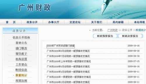 查詢方式為,登陸廣州財政網(wǎng)站()后,點擊打開“政務公開”欄目中的“數(shù)據(jù)統(tǒng)計”一欄(/zwgk/sjtj/index.htm),可以看到《2009年廣州市本級部門預算》的鏈接,打開之后為一個簡單的114個部門的索引列表。