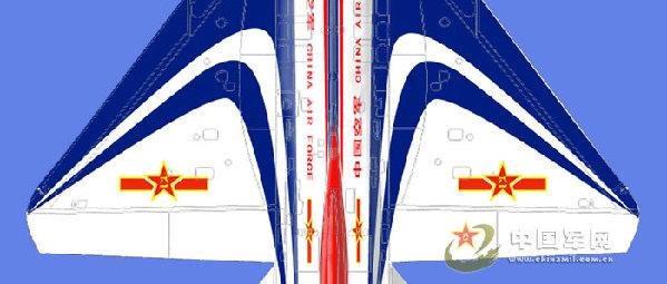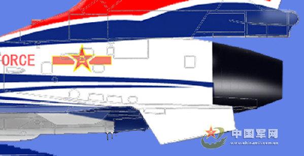 殲-10表演機(jī)的機(jī)徽與空軍軍機(jī)機(jī)徽相同,為軍徽兩邊襯一鑲有對(duì)稱的金黃色等邊的紅帶,中間嵌金黃色“八一”二字,“八一”為宋體漢字。噴涂在機(jī)身后部左右兩側(cè)、左右機(jī)翼上表面,共4處(見(jiàn)圖7、8、9)
