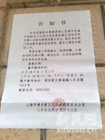 上海新民網(wǎng)今日透露以上信息。據(jù)報(bào)道,一份28日由上海市浦東新區(qū)人民政府信訪辦公室出具的告知書稱:“針對近期部分曾被原南匯區(qū)城市交通行政執(zhí)法大隊(duì)因非法運(yùn)營而查扣及處罰的當(dāng)事人對原處理情況提出異議,新區(qū)有關(guān)部門將本著實(shí)事求是的原則,集中開展信訪接待工作!