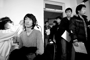 體檢內(nèi)容包括內(nèi)外科中的眼、耳、聽力、身高、體重、心電圖、血尿,以及心理、毒品、艾滋病等多項檢查,在視力檢查室,等待檢查的應(yīng)屆學(xué)生已排起了長隊,主檢醫(yī)生對應(yīng)征青年視力的各項指標進行了檢查,包括近視、斜視、色盲等內(nèi)容。主檢醫(yī)生告訴記者,每年因視力不合格的占應(yīng)征者的30%左右。