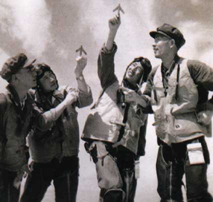 “01,敵F-4兩架侵入我國領空,已被我高炮部隊擊落一架,另一架正在你右前方二十五公里,繼續(xù)向我境內(nèi)飛行。航向一百六十度、高度二千米、速度一千公里,準備戰(zhàn)斗!钡孛嬷笓]員向飛行員發(fā)出了命令。宋義民立即指揮戰(zhàn)友調(diào)整空中戰(zhàn)斗隊形,組織搜索警戒。情況顯示板上、熒光屏上敵機的航跡在不斷地向我境內(nèi)延伸。突然,二號機趙廣江大聲報告“右前方發(fā)現(xiàn)一架敵機。”指揮員拿起話筒:“跟上去,狠狠打!”隨即一號機、三號機、四號機都發(fā)現(xiàn)了目標,在長機宋義民的指揮下,三架飛機加大油門一齊向敵機撲去。