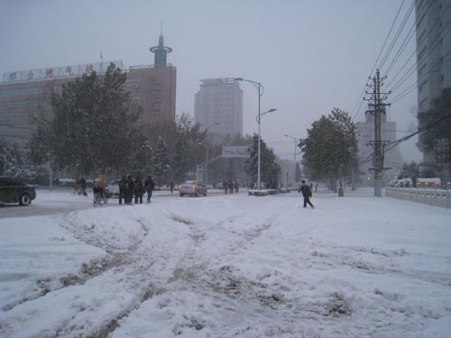 石家莊市區(qū)大雪將部分樹枝壓斷,公共交通嚴(yán)重受阻,路上車輛稀少,許多市民只有提前步行上班或送孩子上學(xué)。