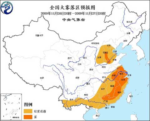 中央氣象臺2009年11月26日18時繼續(xù)發(fā)布大霧橙色警報: